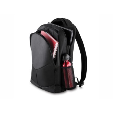Mochila poliéster para notebook com detalhes em nylon e neoprene. Possui compartimento grande com bolso interno, compartimento médio, dois bolsos laterais de rede, alça superior e alça traseira com es..